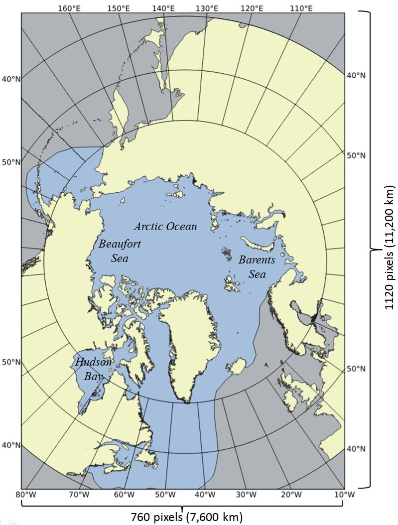 This product fetches observation data from the SAR Sea Ice Berg Concentration and Individual Icebergs Observed with Sentinel-1 & RCM dataset, covering the Arctic ocean plus parts of the northwestern Atlantic as shown.